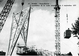 Lorsque Sylvain est venu à Rouen et que nous visitions les rue piétonnes que nous devons à Monsieur Lecanuet, Il s’émerveilla de l’église Jeanne d’Arc place de la Pucelle. A mon avis ce n’est que justice et j’avoue beaucoup aimer cet ensemble que l’on doit à Monsieur Arretche. Très contesté à l’époque, je me souviens de ces débats dans mon enfance, il semble que les rouennais, pour une fois, se sont laissé séduire par ce bâtiment. Fait d’un toit d’ardoises audacieux, très épineux et très enflammé, référence évidente au bûcher de Jeanne, il apporte à ce quartier une spectaculaire mise en scène. La construction a sauvé les vitraux de l’ancienne église. J’ai eu la chance de trouver des cartes postales représentant le chantier de l’église. Je vous les propose. Je me souviens être venu avec mes parents visiter le bâtiment juste après sa construction et de l’admiration (forcément contagieuse) de mon père pour cette modernité audacieuse.
