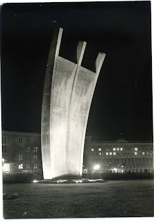 Je poursuis avec le monument du pont aérien devant l'aérogare de Berlin Tempelhof. On dirait qu'ici a échoué un morceau de pont autoroutier. Posé là, il pourrait aussi attendre d'être terminé. C'est remarquablement... sobre comme monument. Derrière l'aéroport construit par Ernst Sagebiel sous le régime nazi. La nuit est tombée.