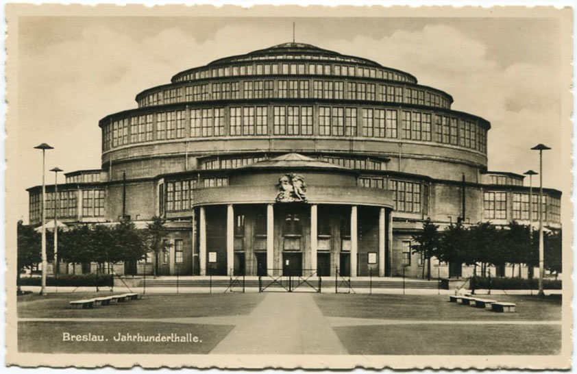 J'ai dans ma collection deux cartes postales de la halle du centenaire à Breslau. Je pourrais tout aussi bien écrire : j'ai deux cartes postales de la halle du centenaire à Wroclaw puisque la ville porte les deux noms. Cette halle est un monstre de l'histoire du béton. Construite au début du siècle dernier, elle est sans aucun doute l'une des constructions sans pilier intérieur la plus vaste jamais construite. Et, en plus,